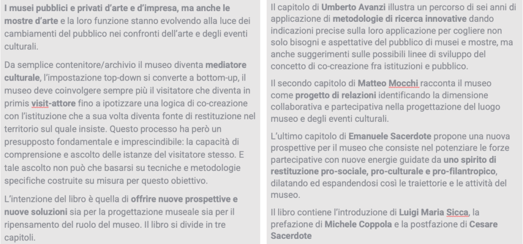 E’ anche di queste “ruote“ che si parla ne “Il museo dialogante”, un libro sui musei e per i musei, nato dall’ascolto dei visitatori e arricchito grazie alla collaborazione con i due coautori Matteo Mocchi ed Emanuele Sacerdote.