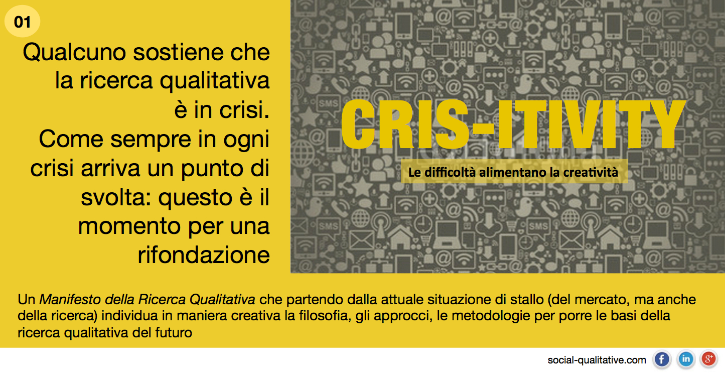 “Qualcuno sostiene che la ricerca qualitativa è in crisi. Come sempre in ogni crisi arriva un punto di svolta: questo è il momento per una rifondazione. Un Manifesto della Ricerca Qualitativa che partendo dalla attuale situazione di stallo (del mercato, ma anche della ricerca) individua in maniera creativa la filosofia, gli approcci, le metodologie per porre le basi della ricerca qualitativa del futuro”
