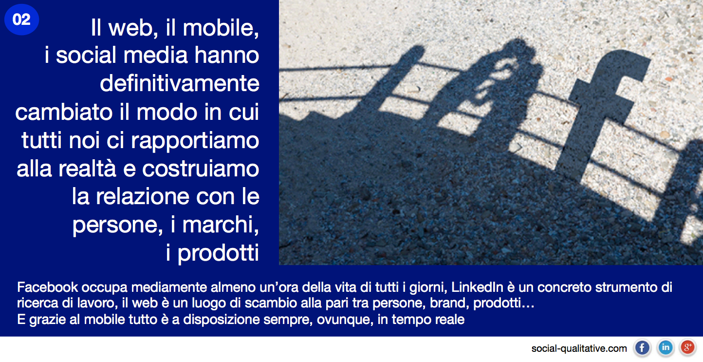 “Il web, il mobile, i social media hanno definitivamente cambiato il modo in cui tutti noi ci rapportiamo alla realtà e costruiamo la relazione con le persone, i marchi, i prodotti. Facebook occupa mediamente almeno un’ora della vita di tutti i giorni, LinkedIn è un concreto strumento di ricerca di lavoro, il web è un luogo di scambio alla pari tra persone, brand, prodotti… E grazie al mobile tutto è a disposizione sempre, ovunque, in tempo reale”