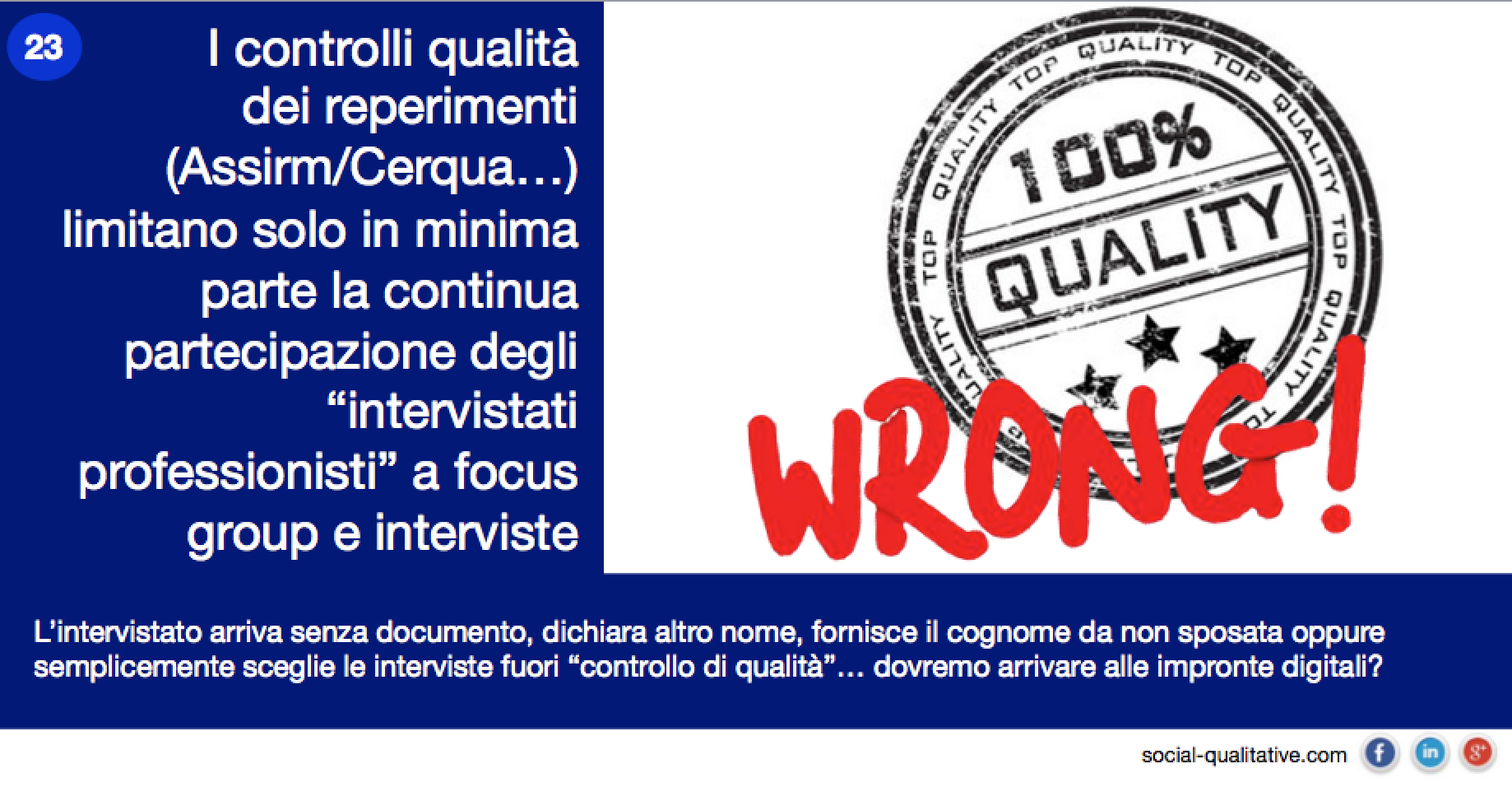 “I controlli qualità dei reperimenti (Assirm/Cerqua…) limitano solo in minima parte la continua partecipazione degli “intervistati professionisti” a focus group e interviste. L’intervistato arriva senza documento, dichiara altro nome, fornisce il cognome da non sposata oppure semplicemente sceglie le interviste fuori “controllo di qualità”… dovremo arrivare alle impronte digitali?”