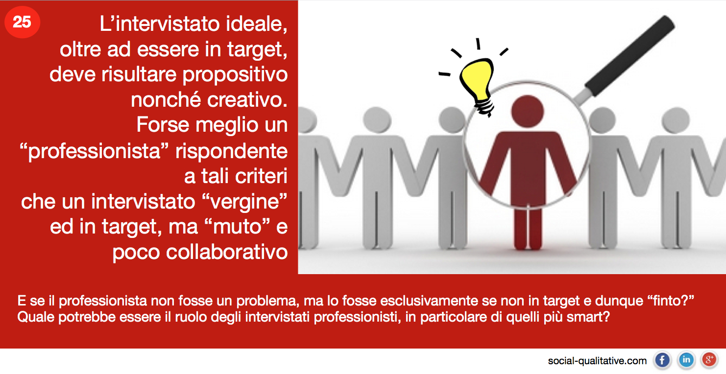 “L’intervistato ideale, oltre ad essere in target, deve risultare propositivo nonché creativo. Forse meglio un “professionista” rispondente a tali criteri che un intervistato “vergine” ed in target, ma “muto” e poco collaborativo. E se il professionista non fosse un problema, ma lo fosse esclusivamente se non in target e dunque “finto?” Quale potrebbe essere il ruolo degli intervistati professionisti, in particolare di quelli più smart?”