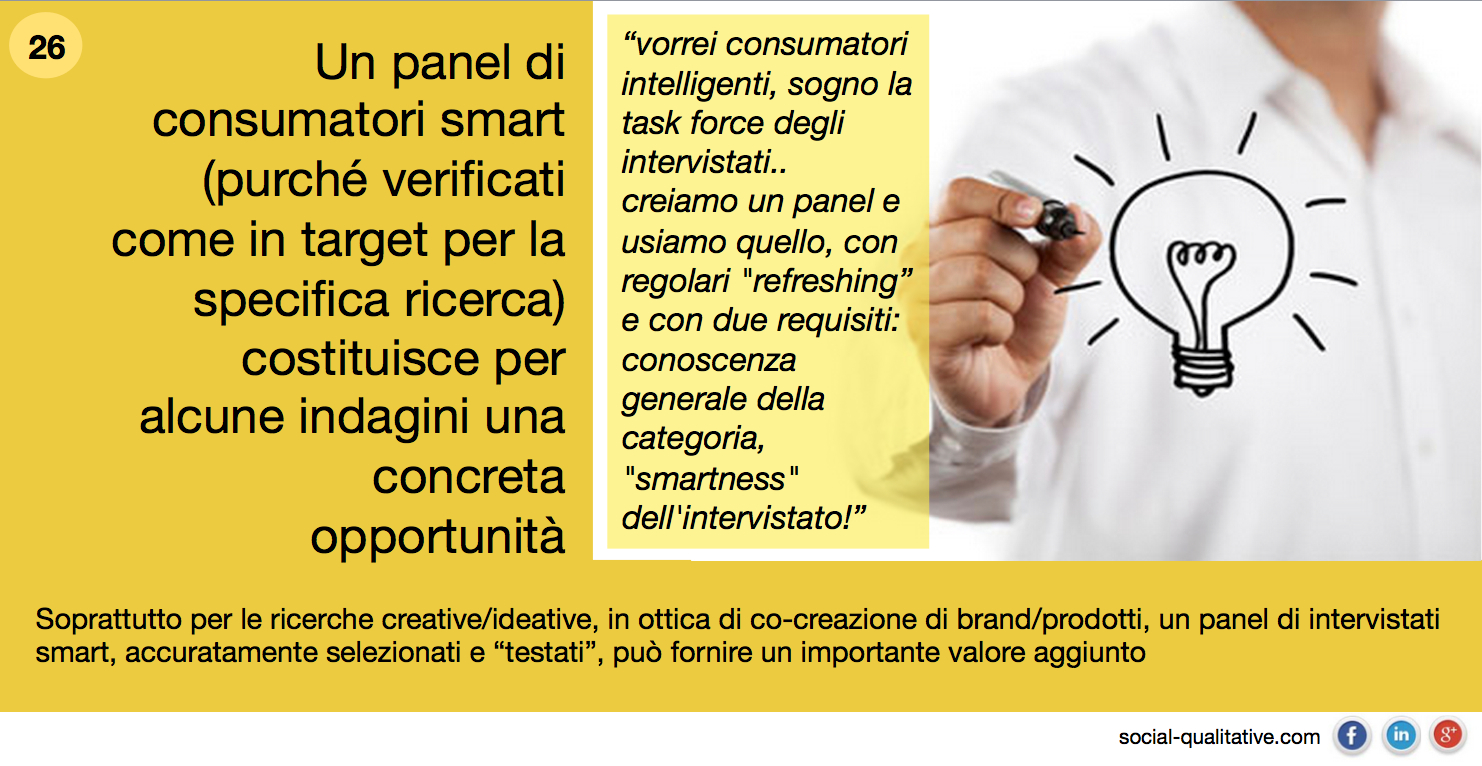 “Un panel di consumatori smart (purché verificati come in target per la specifica ricerca) costituisce per alcune indagini una concreta opportunità. Soprattutto per le ricerche creative/ideative, in ottica di co-creazione di brand/prodotti, un panel di intervistati smart, accuratamente selezionati e “testati”, può fornire un importante valore aggiunto”