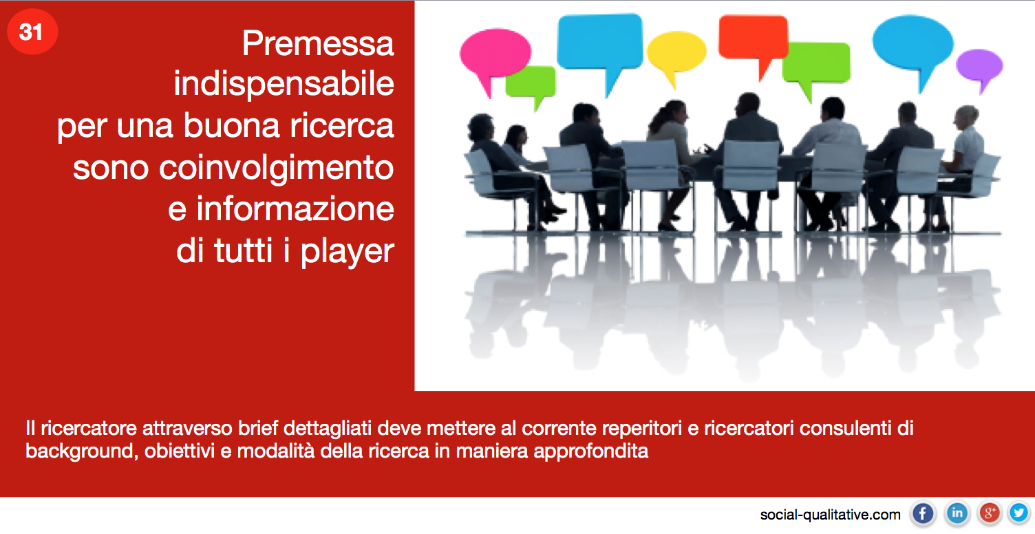 “Premessa indispensabile per una buona ricerca sono coinvolgimento e informazione di tutti i player. Il ricercatore attraverso brief dettagliati deve mettere al corrente reperitori e ricercatori consulenti di background, obiettivi e modalità della ricerca in maniera approfondita”