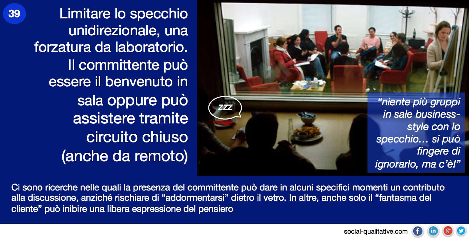 “Limitare lo specchio unidirezionale, una forzatura da laboratorio. Il committente può essere il benvenuto in sala oppure può assistere tramite circuito chiuso (anche da remoto). Ci sono ricerche nelle quali la presenza del committente può dare in alcuni momenti specifici un contributo alla discussione, anziché rischiare di “addormentarsi” dietro il vetro. In altre anche solo il “fantasma del cliente” può inibire una libera espressione del pensiero”