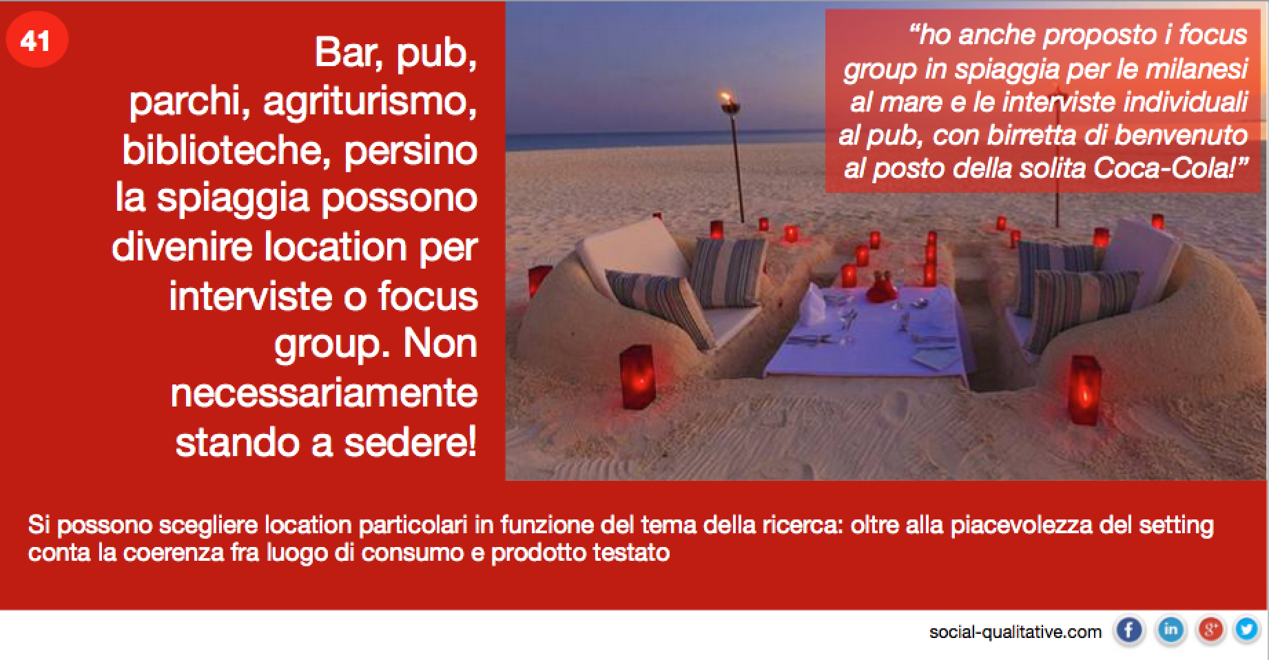 “Bar, pub, parchi, agriturismo, biblioteche, persino la spiaggia possono divenire location per interviste o focus group. E non necessariamente stando a sedere! Si possono scegliere location particolari in funzione del tema della ricerca: oltre alla piacevolezza del setting conta la coerenza fra luogo di consumo e prodotto testato”