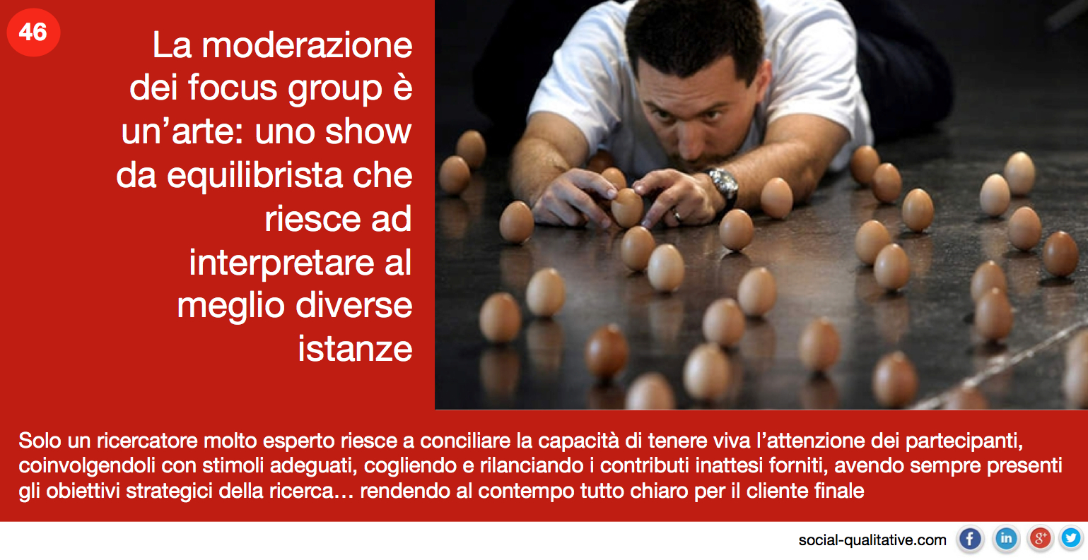 “La moderazione dei focus group è un’arte: uno show da equilibrista che riesce ad interpretare al meglio diverse istanze. Solo un ricercatore molto esperto riesce a conciliare la capacità di tenere viva l’attenzione dei partecipanti, coinvolgendoli con stimoli adeguati, cogliendo e rilanciando i contributi inattesi forniti, avendo sempre presenti gli obiettivi strategici della ricerca… rendendo al contempo tutto chiaro per il cliente finale”