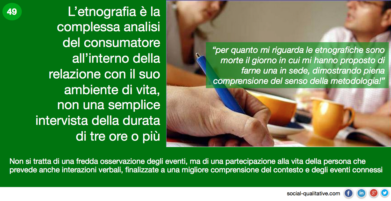 “L’etnografia è la complessa analisi del consumatore all’interno della relazione con il suo ambiente di vita, non una semplice intervista della durata di tre ore o più. Non si tratta di una fredda osservazione degli eventi, ma di una partecipazione alla vita della persona che prevede anche interazioni verbali, finalizzate a una migliore comprensione del contesto e degli eventi connessi”