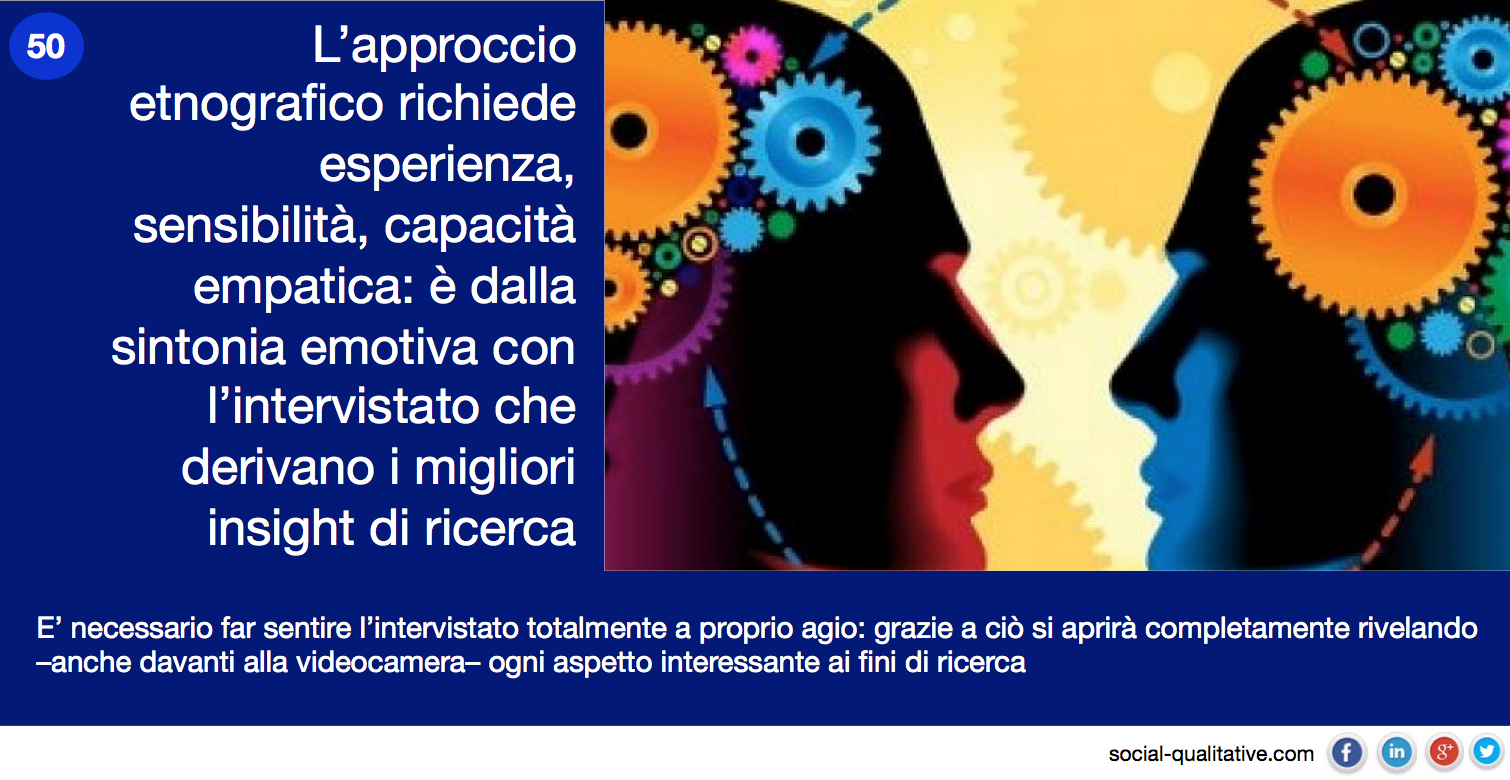 “L’approccio etnografico richiede esperienza, sensibilità, capacità empatica: è dalla sintonia emotiva con l’intervistato che derivano i migliori insight di ricerca. E’ necessario far sentire l’intervistato totalmente a proprio agio: grazie a ciò si aprirà completamente rivelando –anche davanti alla videocamera– ogni aspetto interessante ai fini di ricerca”