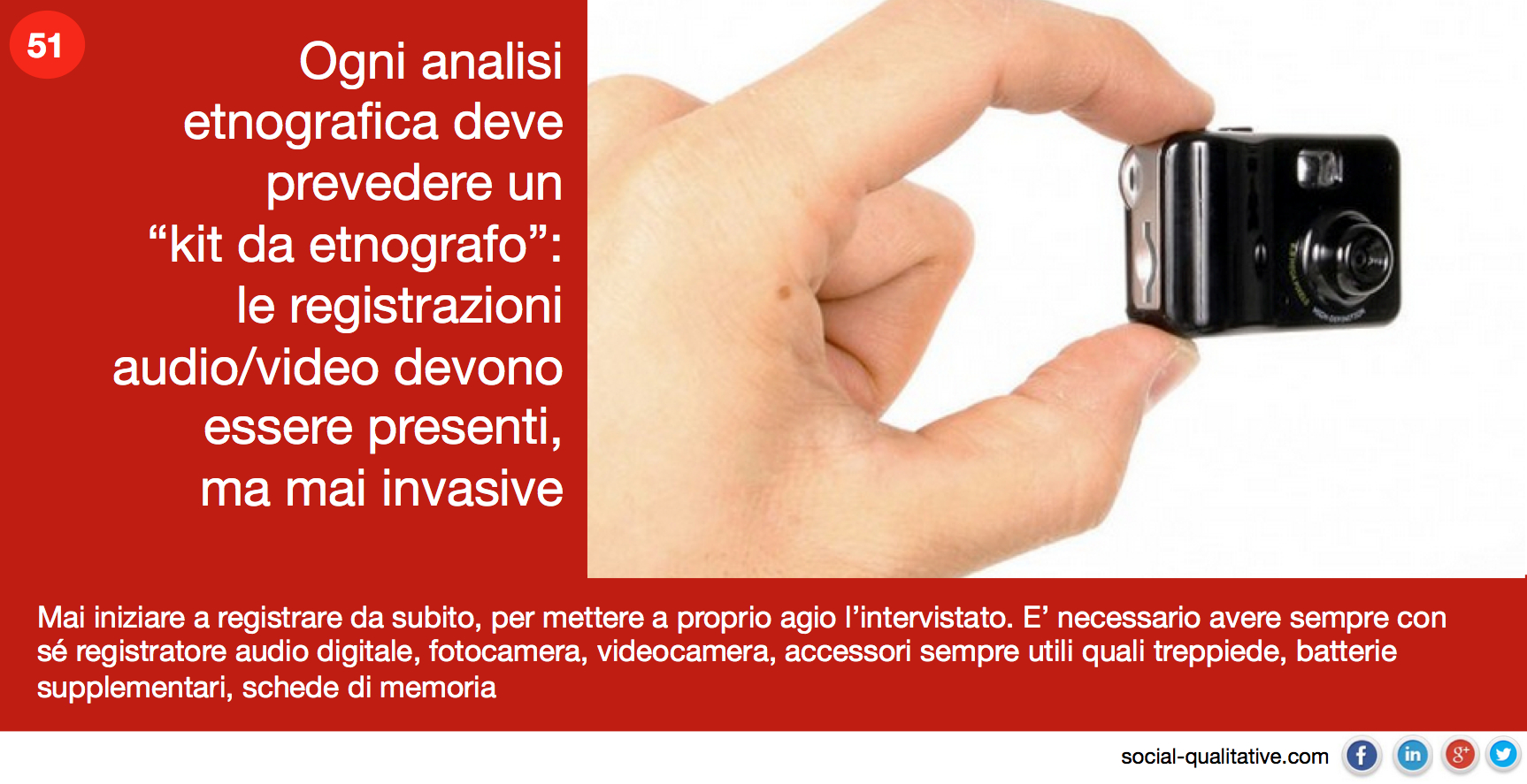 “Ogni analisi etnografica deve prevedere un “kit da etnografo”: le registrazioni audio/video devono essere presenti, ma mai invasive. Mai iniziare a registrare da subito, per mettere a proprio agio l’intervistato. E’ necessario avere sempre con sé registratore audio digitale, fotocamera, videocamera, accessori sempre utili quali treppiede, batterie supplementari, schede di memoria”
