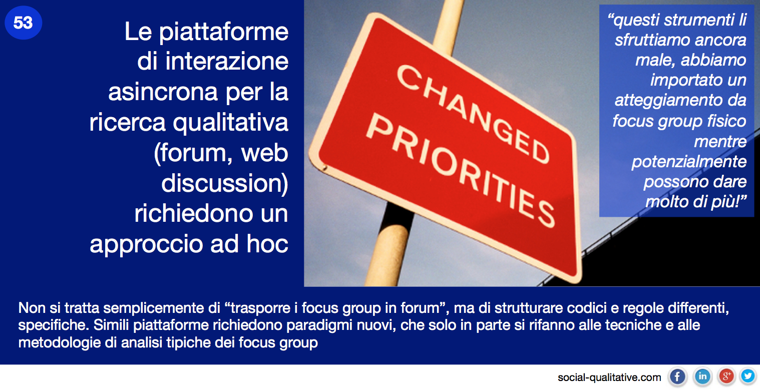 “Le piattaforme di interazione asincrona per la ricerca qualitativa (forum, web discussion) richiedono un approccio ad hoc. Non si tratta semplicemente di “trasporre i focus group in forum”, ma di strutturare codici e regole differenti, specifiche. Simili piattaforme richiedono paradigmi nuovi, che solo in parte si rifanno alle tecniche e alle metodologie di analisi tipiche dei focus group”