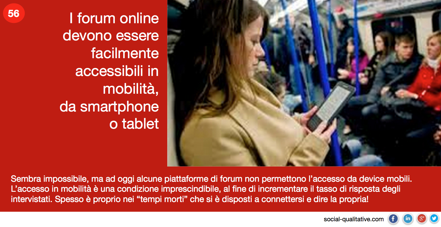 “I forum online devono essere facilmente accessibili in mobilità, da smartphone o tablet. Sembra impossibile, ma ad oggi alcune piattaforme di forum non permettono l’accesso da device mobili. L’accesso in mobilità è una condizione imprescindibile, al fine di incrementare il tasso di risposta degli intervistati. Spesso è proprio nei “tempi morti” che si è disposti a connettersi e dire la propria!”