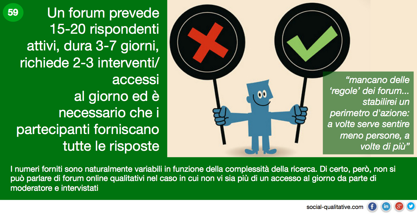 “Un forum prevede 15-20 rispondenti attivi, dura 3-7 giorni, richiede 2-3 interventi/accessi al giorno ed è necessario che i partecipanti forniscano tutte le risposte. I numeri forniti sono naturalmente variabili in funzione della complessità della ricerca. Di certo, però, non si può parlare di forum online qualitativi nel caso in cui non vi sia più di un accesso al giorno da parte di moderatore e intervistati”