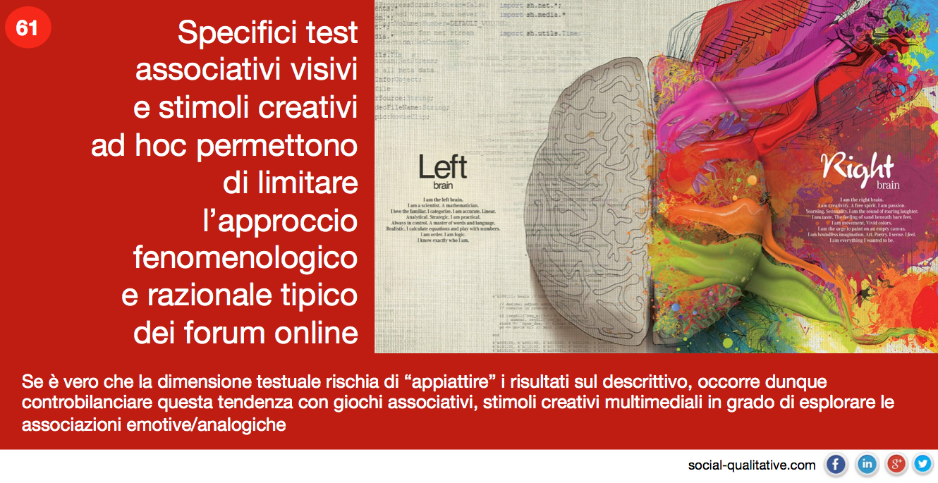 “Specifici test associativi visivi e stimoli creativi ad hoc permettono di limitare l’approccio fenomenologico e razionale tipico dei forum online. Se è vero che la dimensione testuale rischia di “appiattire” i risultati sul descrittivo, occorre dunque controbilanciare questa tendenza con giochi associativi, stimoli creativi multimediali in grado di esplorare le associazioni emotive/analogiche”