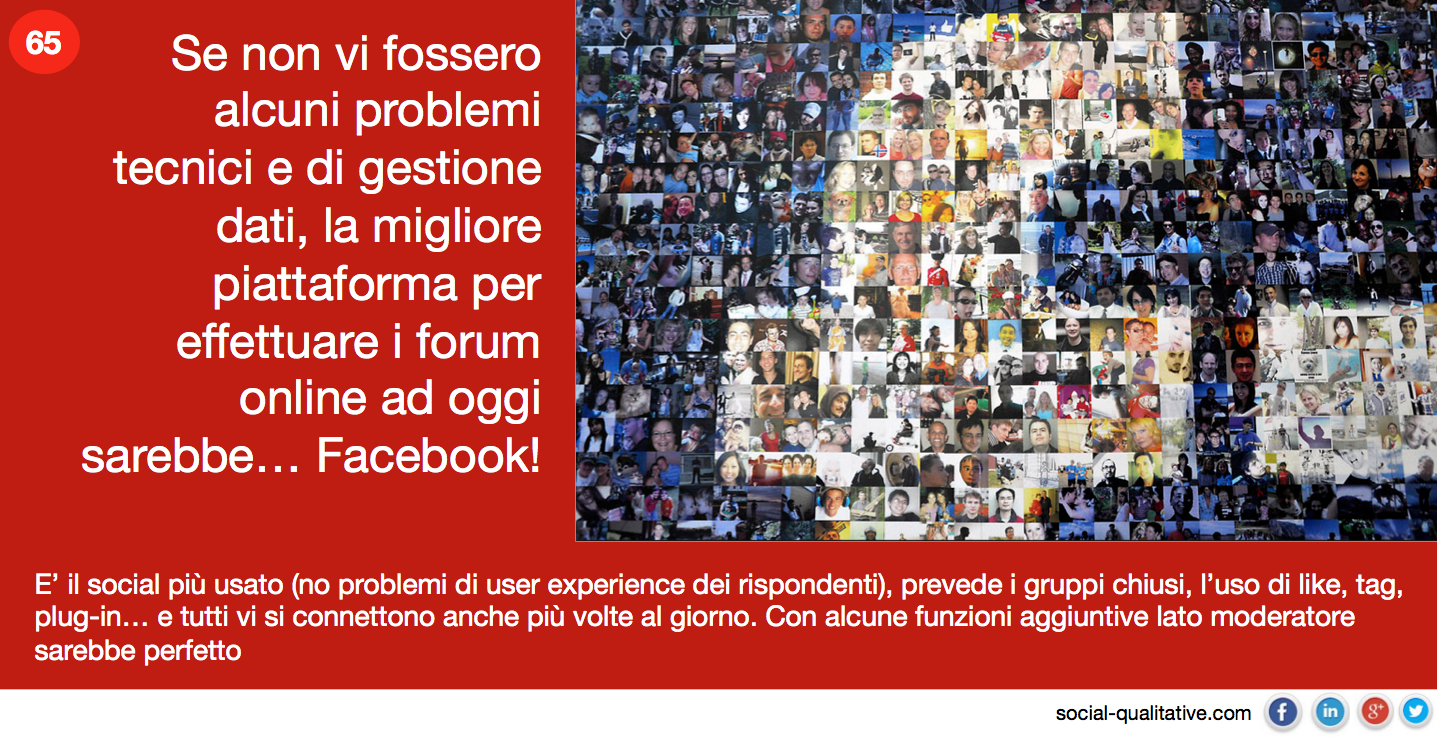 “Se non vi fossero alcuni problemi tecnici e di gestione dati, la migliore piattaforma per effettuare i forum online ad oggi sarebbe… Facebook! E’ il social più usato (no problemi di user experience dei rispondenti), prevede i gruppi chiusi, l’uso di like, tag, plug-in… e tutti vi si connettono anche più volte al giorno. Con alcune funzioni aggiuntive lato moderatore sarebbe perfetto”