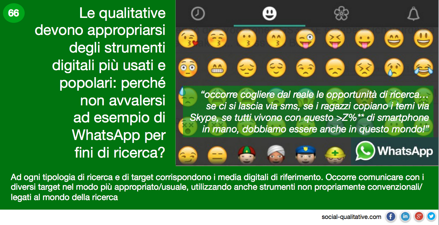 “Le qualitative devono appropriarsi degli strumenti digitali più usati e popolari: perché non avvalersi ad esempio di WhatsApp per fini di ricerca? Ad ogni tipologia di ricerca e di target corrispondono i media digitali di riferimento. Occorre comunicare con i diversi target nel modo più appropriato/usuale, utilizzando anche strumenti non propriamente convenzionali/legati al mondo della ricerca”