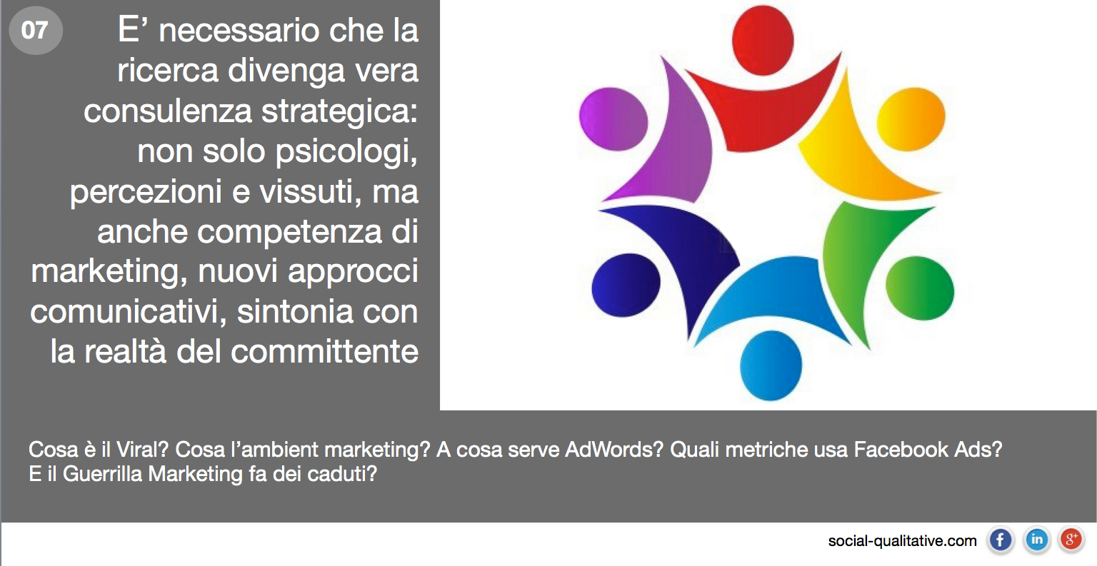 “E’ necessario che la ricerca divenga vera consulenza strategica: non solo psicologi, percezioni e vissuti, ma anche competenza di marketing, nuovi approcci comunicativi, sintonia con la realtà del committente. Cosa è il Viral? Cosa l’ambient marketing? A cosa serve AdWords? Quali metriche usa Facebook Ads? E il Guerrilla Marketing fa dei caduti?”