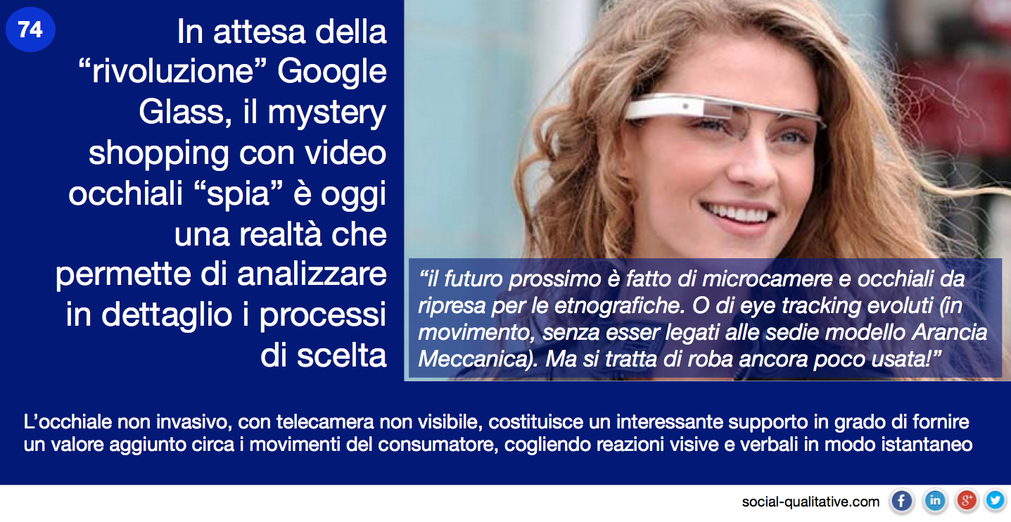 “In attesa della “rivoluzione” Google Glass, il mystery shopping con video occhiali “spia” è oggi una realtà che permette di analizzare in dettaglio i processi di scelta. L’occhiale non invasivo, con telecamera non visibile, costituisce un interessante supporto in grado di fornire un valore aggiunto circa i movimenti del consumatore, cogliendo reazioni visive e verbali in modo istantaneo”