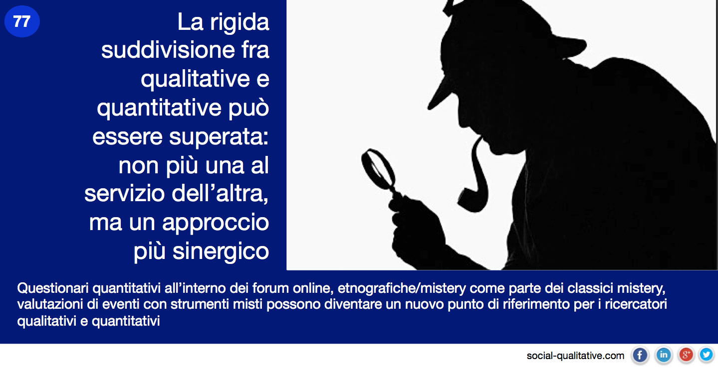 “La rigida suddivisione fra qualitative e quantitative può essere superata: non più una al servizio dell’altra, ma un approccio più sinergico. Questionari quantitativi all’interno dei forum online, etnografiche/mistery come parte dei classici mistery, valutazioni di eventi con strumenti misti possono diventare un nuovo punto di riferimento per i ricercatori qualitativi e quantitativi”