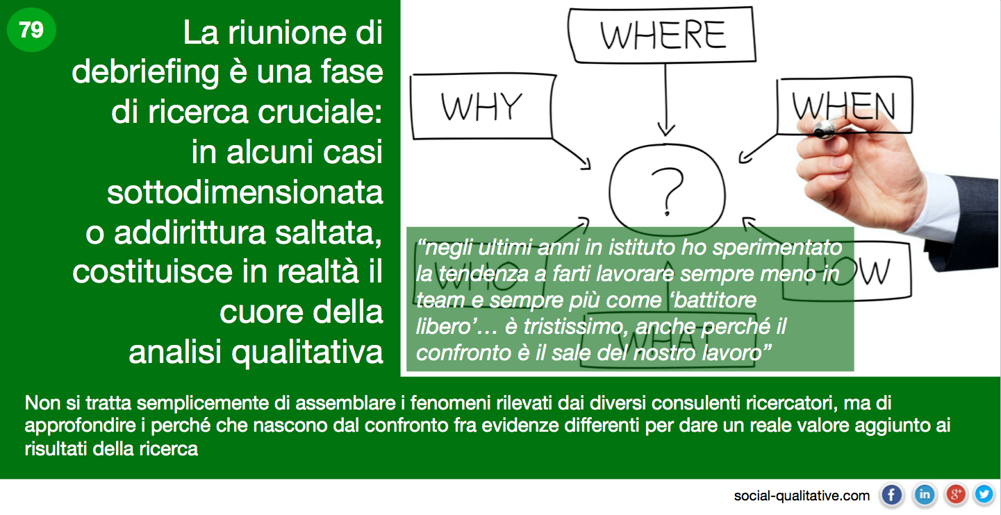 “La riunione di debriefing è una fase di ricerca cruciale: in alcuni casi sottodimensionata o addirittura saltata, costituisce in realtà il cuore della analisi qualitativa. Non si tratta semplicemente di assemblare i fenomeni rilevati dai diversi consulenti ricercatori, ma di approfondire i perché che nascono dal confronto fra evidenze differenti per dare un reale valore aggiunto ai risultati della ricerca”