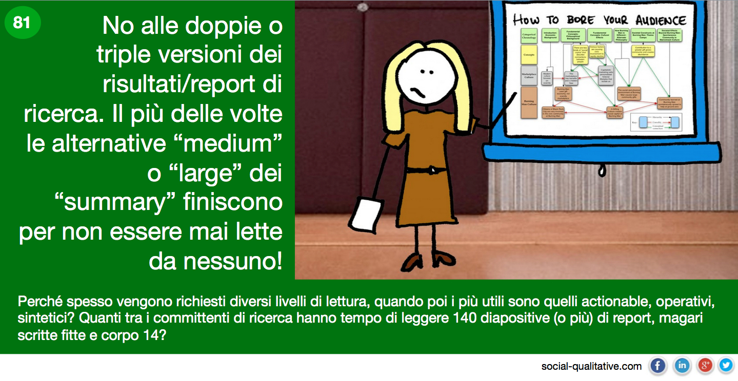 “No alle doppie o triple versioni dei risultati/report di ricerca. Il più delle volte le alternative “medium” o “large” dei “summary” finiscono per non essere mai lette da nessuno! Perché spesso vengono richiesti diversi livelli di lettura, quando poi i più utili sono quelli actionable, operativi, sintetici? Quanti tra i committenti di ricerca hanno tempo di leggere 140 diapositive (o più) di report, magari scritte fitte e corpo 14?”