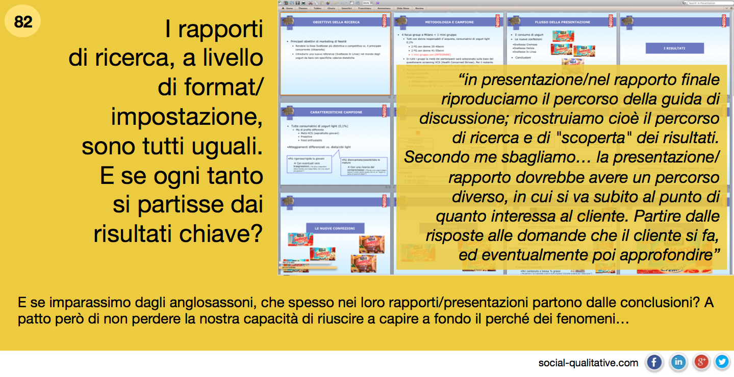 “I rapporti di ricerca, a livello di format/impostazione, sono tutti uguali. E se ogni tanto si partisse dai risultati chiave? E se imparassimo dagli anglosassoni, che spesso nei loro rapporti/presentazioni partono dalle conclusioni? A patto però di non perdere la nostra capacità di riuscire a capire a fondo il perché dei fenomeni…”
