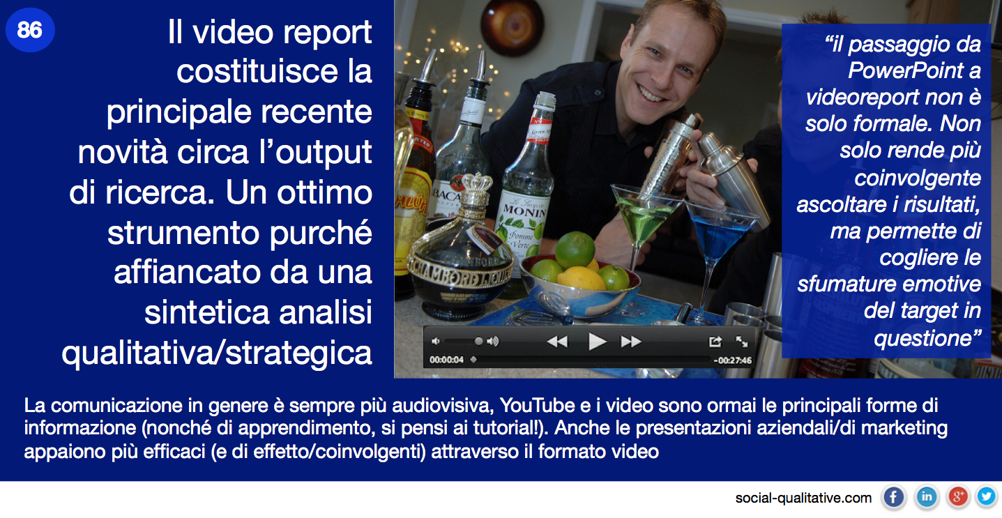 “Il video report costituisce la principale recente novità circa l’output di ricerca. Un ottimo strumento purché affiancato da una sintetica analisi qualitativa/strategica. La comunicazione in genere è sempre più audiovisiva, YouTube e i video sono ormai le principali forme di informazione (nonché di apprendimento, si pensi ai tutorial!). Anche le presentazioni aziendali/di marketing appaiono più efficaci (e di effetto/coinvolgenti) attraverso il formato video”