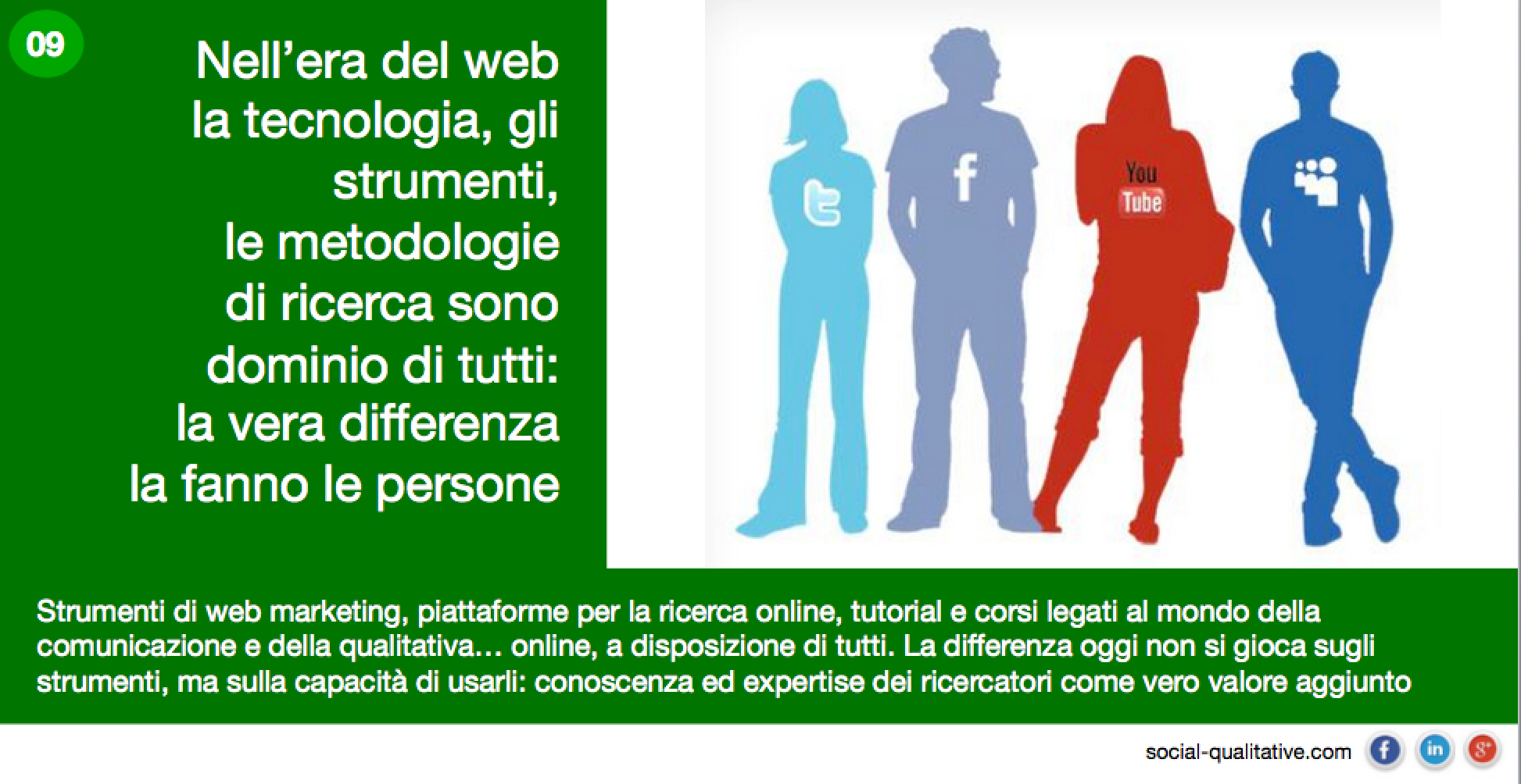 “Nell’era del web la tecnologia, gli strumenti, le metodologie di ricerca sono dominio di tutti: la vera differenza la fanno le persone. Strumenti di web marketing, piattaforme per la ricerca online, tutorial e corsi legati al mondo della comunicazione e della qualitativa… online, a disposizione di tutti. La differenza oggi non si gioca sugli strumenti, ma sulla capacità di usarli: conoscenza ed expertise dei ricercatori come vero valore aggiunto”