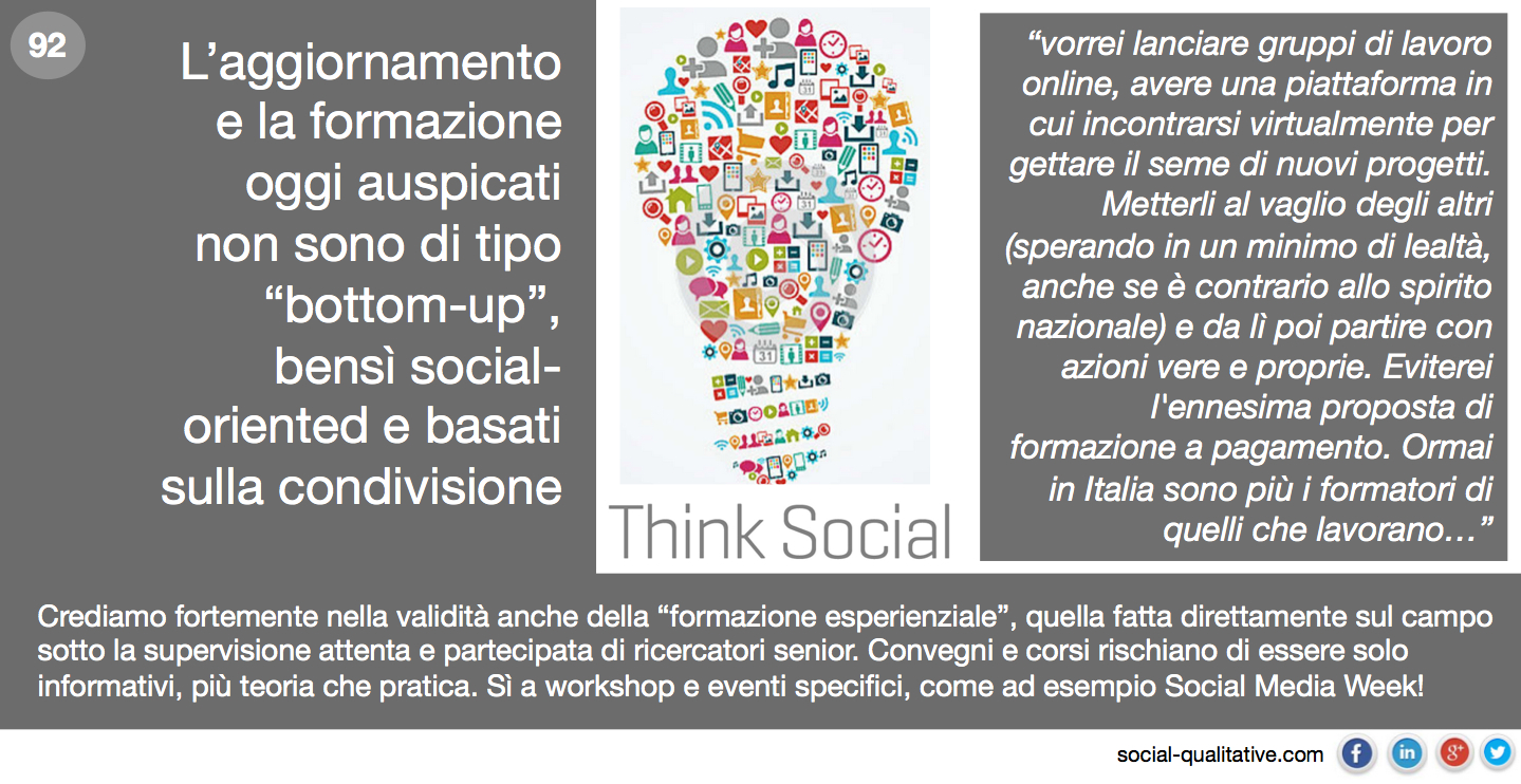 “L’aggiornamento e la formazione oggi auspicati non sono di tipo “bottom-up”, bensì social-oriented e basati sulla condivisione. Crediamo fortemente nella validità anche della “formazione esperienziale”, quella fatta direttamente sul campo sotto la supervisione attenta e partecipata di ricercatori senior. Convegni e corsi rischiano di essere solo informativi, più teoria che pratica. Sì a workshop e eventi specifici, come ad esempio Social Media Week!”