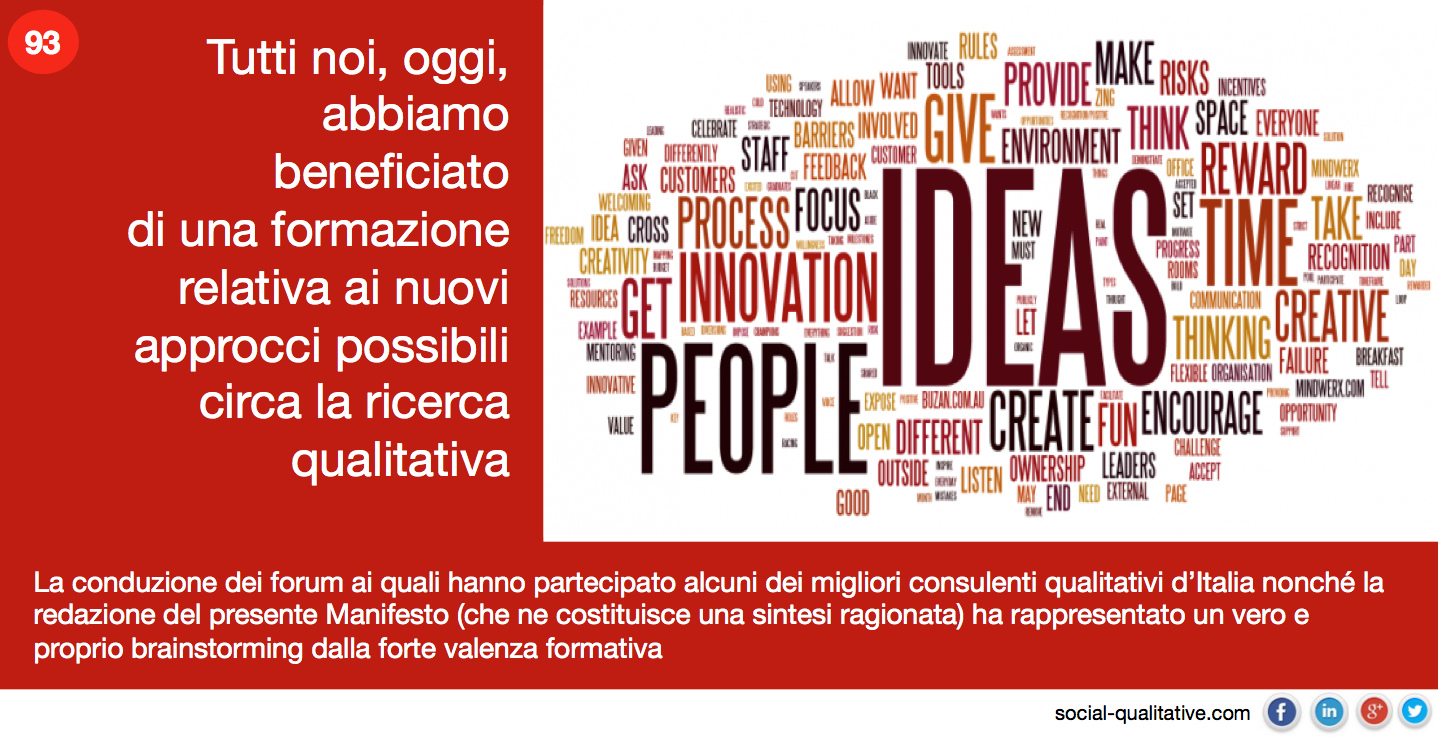 “Tutti noi, oggi, abbiamo beneficiato di una formazione relativa ai nuovi approcci possibili circa la ricerca qualitativa. La conduzione dei forum ai quali hanno partecipato alcuni dei migliori consulenti qualitativi d’Italia nonché la redazione del presente Manifesto (che ne costituisce una sintesi ragionata) ha rappresentato un vero e proprio brainstorming dalla forte valenza formativa”